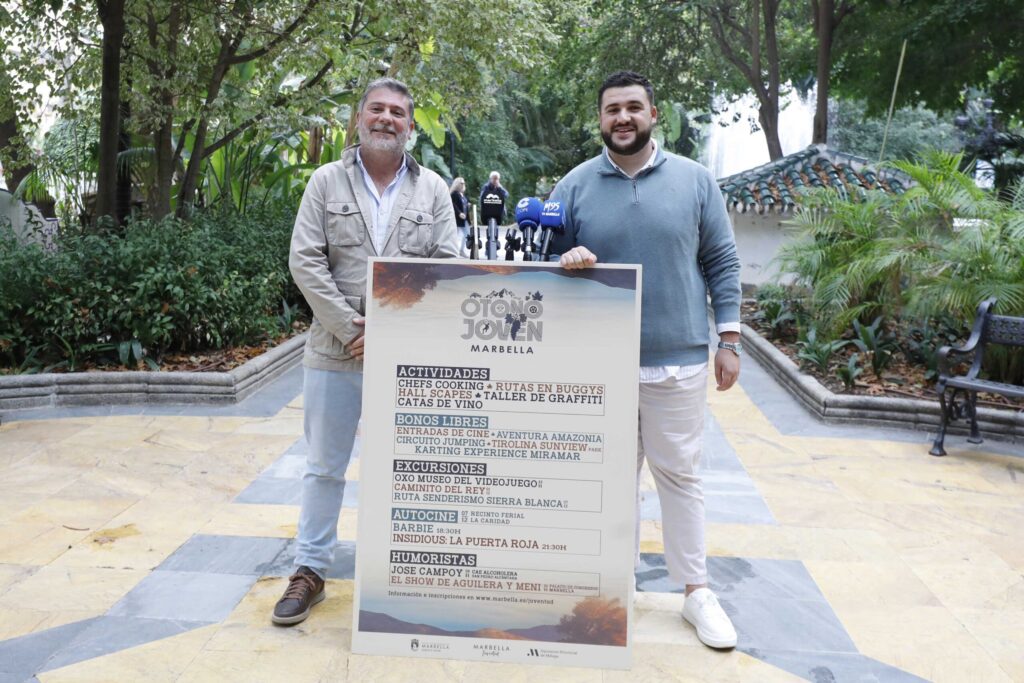 El Ayuntamiento ofrece desde hoy más de 1.000 plazas para actividades de ocio y formación dentro del programa ‘Otoño Joven’, dirigidas a un público de entre 16 y 35 años, aunque a algunas de las citas se podrá optar desde los 14 años. El concejal del ramo, Alejandro González, y el director general de Eventos de San Pedro Alcántara, Rubén Sánchez, han presentado hoy la iniciativa, que también contará con bonos libres, excursiones y autocine.