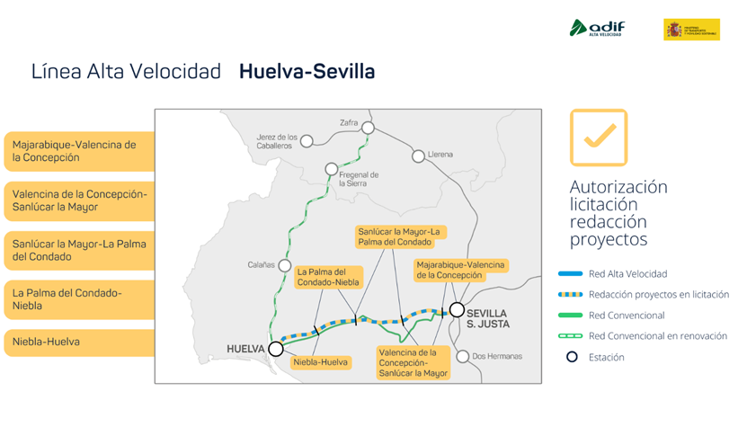 El Consejo de Ministros ha autorizado al Ministerio de Transportes y Movilidad Sostenible la licitación por más de 35 millones de euros (sin IVA) de los proyectos básicos y de construcción de la plataforma de la línea de alta velocidad entre Huelva y Sevilla. La nueva infraestructura permitirá conectar ambas ciudades en 25 minutos, frente a la hora y media de duración actual del trayecto.