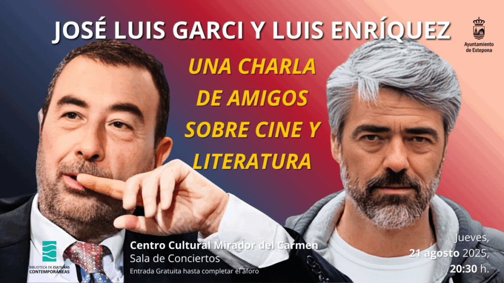 El director de cine José Luis Garci y el gestor de medios Luis Enríquez protagonizarán el próximo 21 de agosto un encuentro en el Centro Cultural Padre Manuel de Estepona. La actividad, titulada «Una charla de amigos sobre Cine y Literatura», comenzará a las 20.30 horas con entrada gratuita y moderación del periodista Francisco Reyero. Los protagonistas ofrecerán su visión sobre el cine y la literatura, además de abrir el debate al público asistente.