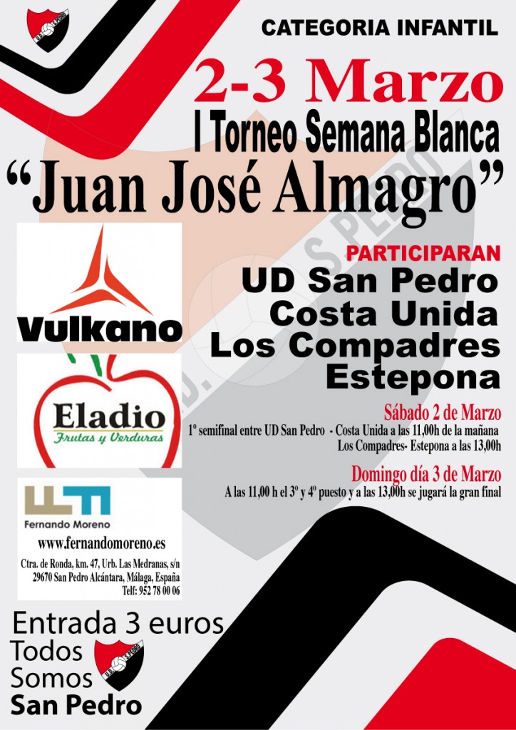 La UD San Pedro ha organizado un torneo de fútbol con la categoría infantil para este fin de semana aprovechando la posibilidad de tiempo libre de los niños al disfrutar de la semana blanca. El torneo «Juan José Almagro» se pretende consolidar como una cita para la cantera de la UD San Pedro y según manifestación del presidente Oscar Escobar «Esta directiva tiene muy claro el objetivo de la Ud San Pedro y no es otro que potencia el deporte de cantera, es por ello que estamos decididos a seguir apostando por el futuro de nuestros hijos y su desarrollo como deportistas a través del fútbol. Pedir a la afición de la UD San Pedro y a los padres que participen de este evento en el que los niños seguramente disfrutarán de un gran ambiente deportivo« En esta ocasión participarán los equipos infantiles de la UD San Pedro, Estepona, Costa Unida y Los compadres. Los emparejamientos y programación de partidos ha quedado así: Sábado 2/03/13 U.D San Pedro-Costa Unida Peña Los Compadres-Unión Estepona Domingo 3/03/13 3º y 4º puesto Gran final Tras finalizar la gran final dará lo comienzo la entrega de trofeos. El precio de la entrada para los partidos es de 3 euros. |