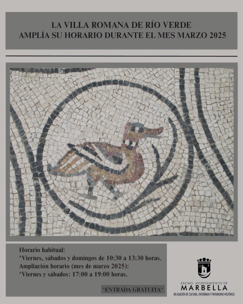 Se han ampliado los horarios de apertura en marzo de la zona arqueológica denominada villa romana de Río Verde, con el objetivo de fomentar la divulgación de este yacimiento. De este modo, entre el día 7 y el 29 de este mes se podrá visitar este espacio cultural los viernes y los sábados desde las 17.00 a las 19.00 horas. Su horario habitual es viernes, sábados y domingos, de 10.30 a 13.30 horas.