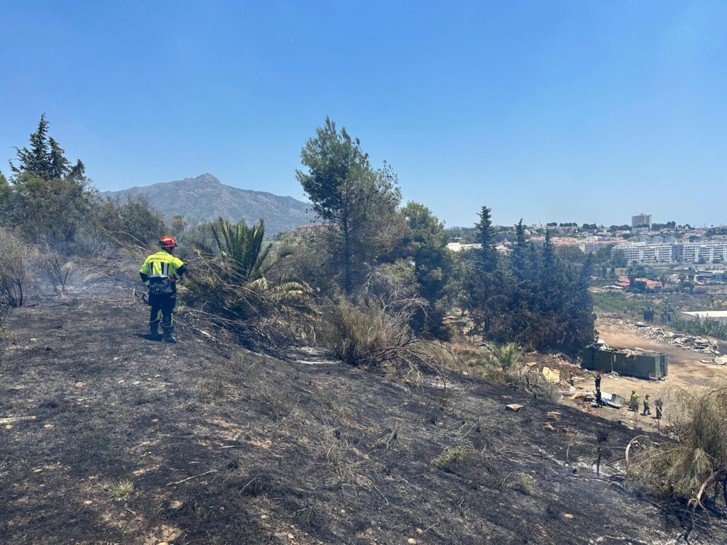 Los Bomberos de Marbella extinguen un incendio anexo al polígono industrial de San Pedro Alcántara evitando que afectara a las viviendas del entorno
